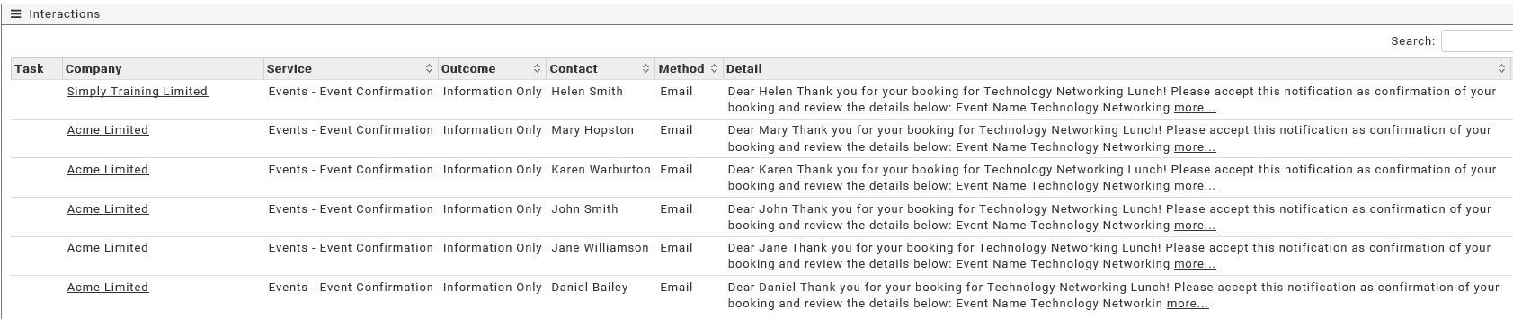 Searches can be performed on company name, company telephone, contact name, contact telephone number, contact mobile, post code, company ID, e-mail address, previous company name and booking ID.