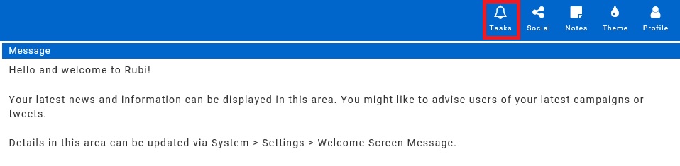 The ‘Tasks & Alerts’ section is located to the left of the ‘Social’ button within the Rubi menu bar. All outstanding alerts and tasks for a user can be accessed in this section.