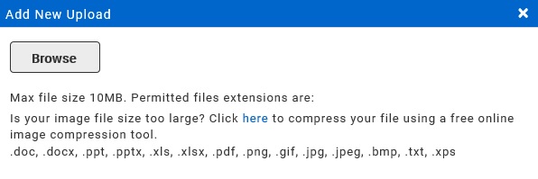 Once selected, a pop-up window will open and users can upload files by selecting the ‘Browse’ button.